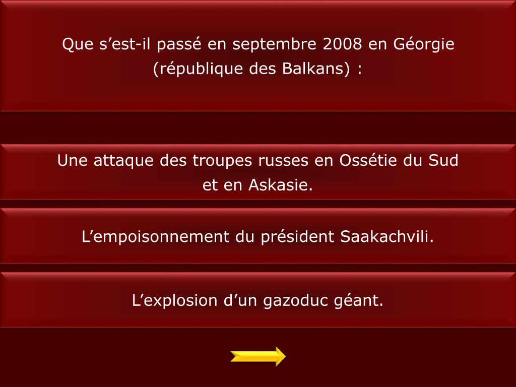 Que s’est-il passé en septembre 2008 en Géorgie (république des Balkans) : Une attaque des troupes russes en Ossétie du Sud et en Askasie. L’empoisonnement du président Saakachvili. L’explosion d’un gazoduc géant.