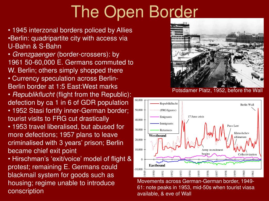 The Open Border • 1945 interzonal borders policed by Allies • Berlin: quadripartite city with access via U-Bahn & S-Bahn • Grenzgaenger (border-crossers): by 1961 50-60,000 E. Germans commuted to W. Berlin; others simply shopped there • Currency speculation across Berlin-Berlin border at 1:5 East:West marks • Republikflucht (flight from the Republic): defection by ca 1 in 6 of GDR population • 1952 Stasi fortify inner-German border; tourist visits to FRG cut drastically • 1953 travel liberalised, but abused for more defections; 1957 plans to leave criminalised with 3 years’ prison; Berlin became chief exit point • Hirschman’s ‘exit/voice’ model of flight & protest; remaining E. Germans could blackmail system for goods such as housing; regime unable to introduce conscription Potsdamer Platz, 1952, before the Wall Movements across German-German border, 1949-61: note peaks in 1953, mid-50s when tourist viasa available, & eve of Wall