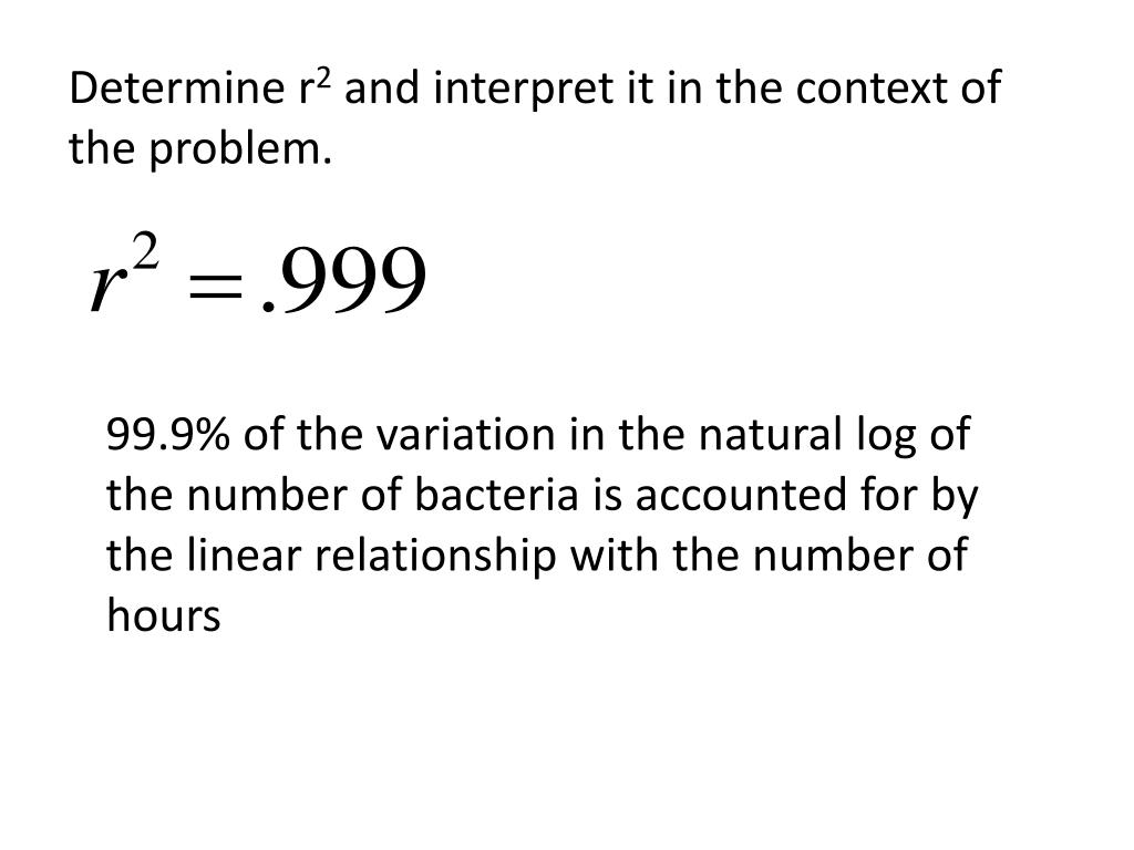 Determine r2 and interpret it in the context of the problem. 99.9% of the variation in the natural log of the number of bacteria is accounted for by the linear relationship with the number of hours
