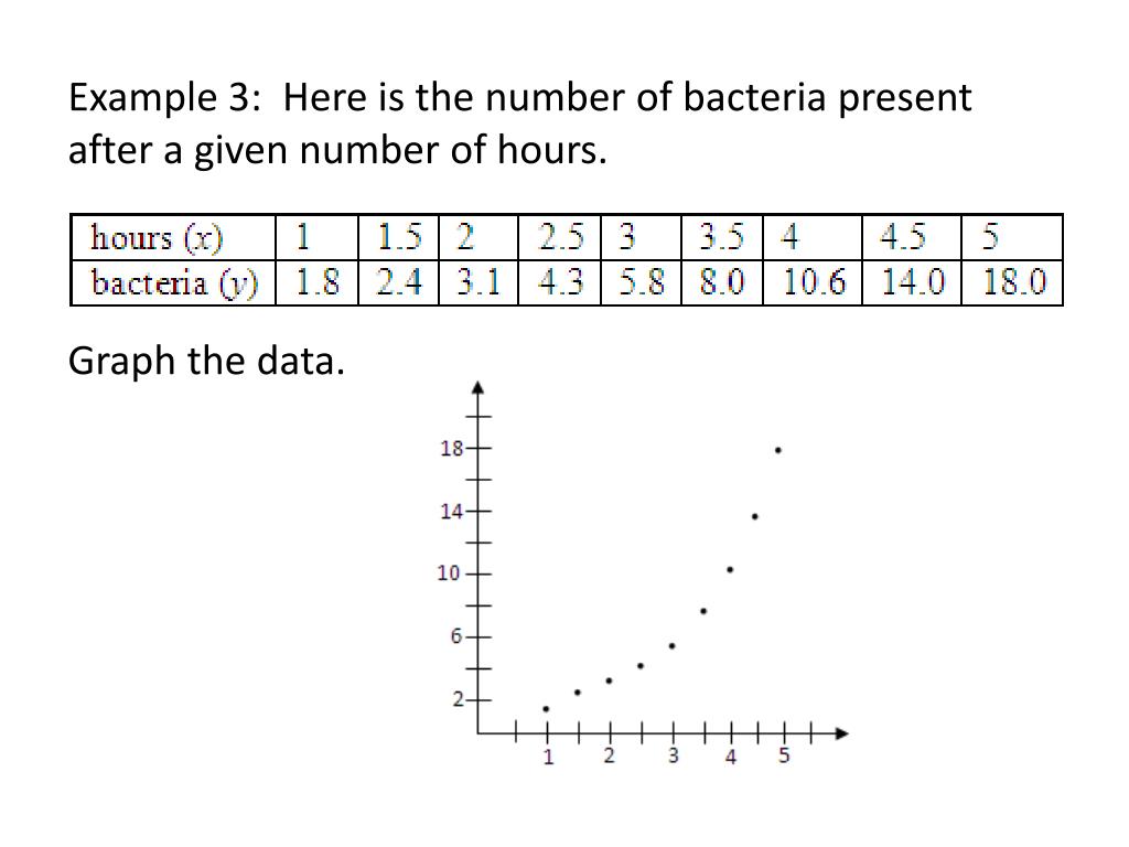 Example 3: Here is the number of bacteria present after a given number of hours.Graph the data.