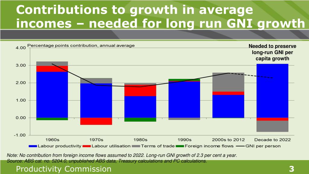 Contributions to growth in average incomes – needed for long run GNI growth Needed to preserve long-run GNI per capita growth Note: No contribution from foreign income flows assumed to 2022. Long-run GNI growth of 2.3 per cent a year. Source: ABS cat. no. 5204.0, unpublished ABS data, Treasury calculations and PC calculations.