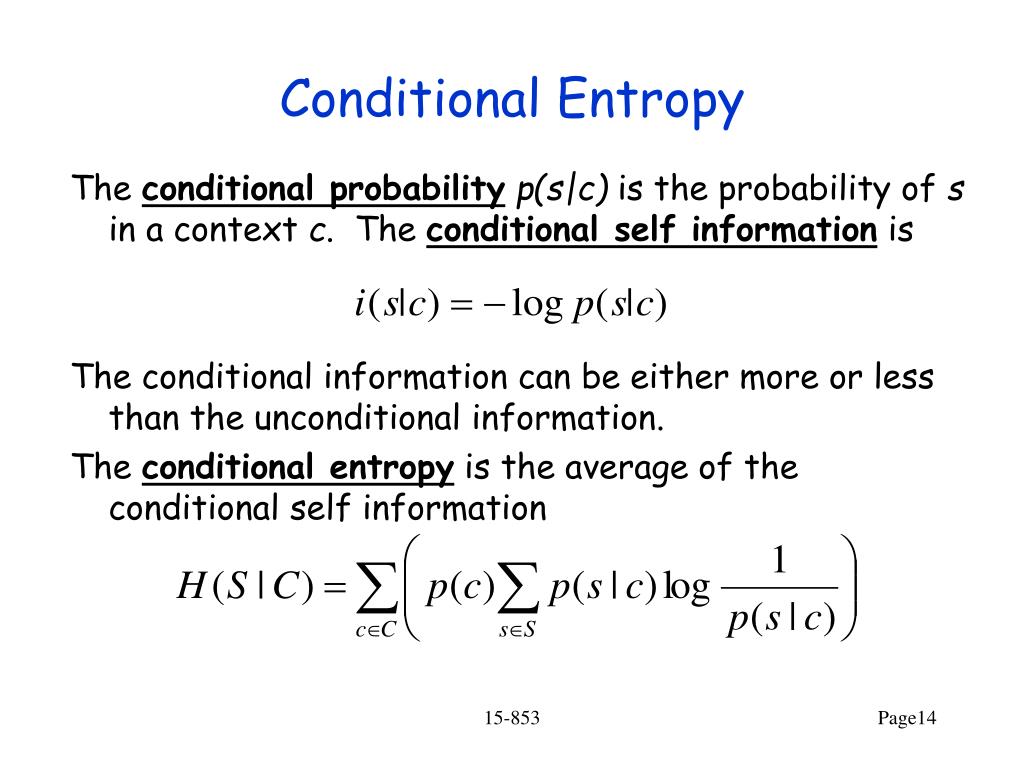 Conditional Entropy The conditional probabilityp(s|c) is the probability of s in a context c. The conditional self information is The conditional information can be either more or less than the unconditional information. The conditional entropy is the average of the conditional self information 15-853