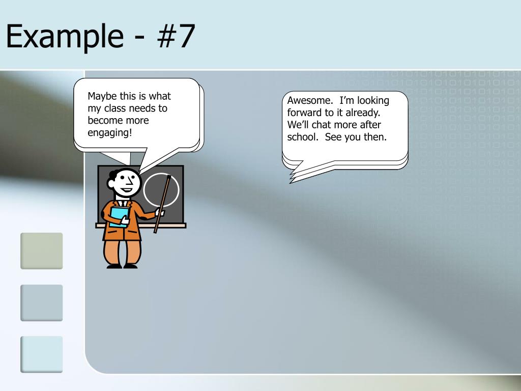 Example - #7 That’s a great idea. You know, many of these kids will really enjoy the hands-on nature of an activity AND, I have always taught it this way – using books and maps – this kids just don’t seem to care So, what do I need to do in the meantime? What exactly will you do? Maybe this is what my class needs to become more engaging! Not too bad, but my students aren’t understanding latitude and longitude very well this year. Awesome. I’m looking forward to it already. We’ll chat more after school. See you then. Well, I don’t know much about GPSs or technology at all. Then, say next Tuesday, I will come into your class and together we can lead the students in a GPS activity Maybe I can give you a hand? Did you know that GPS devices can reinforce the concepts of latitude and longitude? Guess what…I have some time each week. I can come into your class and show them how to use GPSs… You continue to focus on the concepts…and don’t worry about knowing about the technology…I will show them the GPSs Let’s chat more after school about what you want them to learn. Hello Mr. Smith. How are you today?