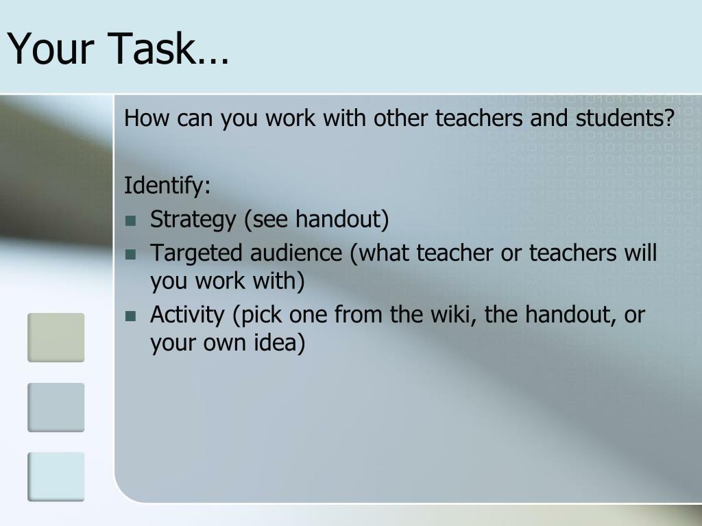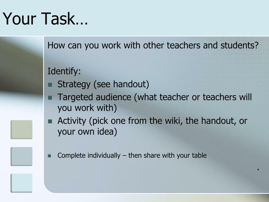 Your Task… How can you work with other teachers and students? Identify: • Strategy (see handout) • Targeted audience (what teacher or teachers will you work with) • Activity (pick one from the wiki, the handout, or your own idea) • Complete individually – then share with your table .