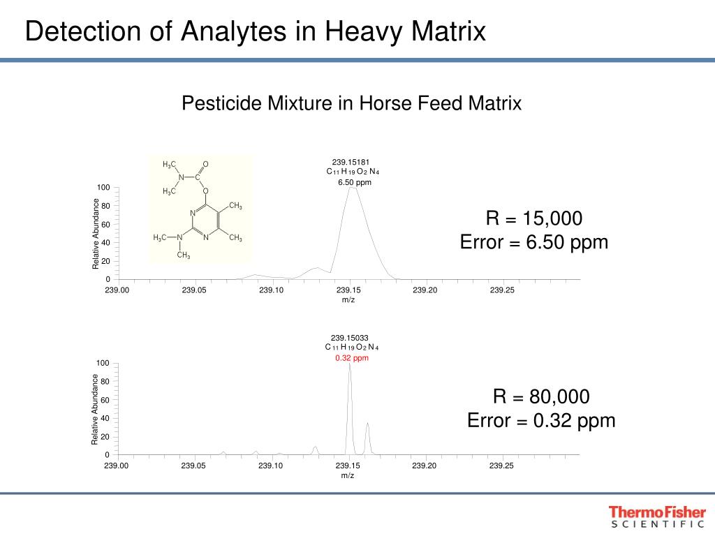 239.15181 C H O N 11 19 2 4 6.50 ppm 100 80 60 Relative Abundance 40 20 0 239.00 239.05 239.10 239.15 239.20 239.25 m/z Detection of Analytes in Heavy Matrix Pesticide Mixture in Horse Feed Matrix 239.15033 C H O N 11 19 2 4 0.32 ppm 100 80 R = 15,000 Error = 6.50 ppm 60 Relative Abundance 40 20 0 239.00 239.05 239.10 239.15 239.20 239.25 m/z R = 80,000 Error = 0.32 ppm