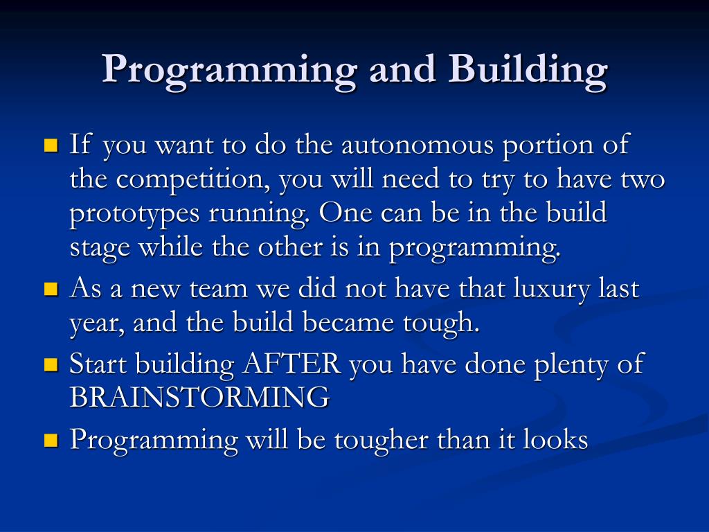 Programming and Building • If you want to do the autonomous portion of the competition, you will need to try to have two prototypes running. One can be in the build stage while the other is in programming. • As a new team we did not have that luxury last year, and the build became tough. • Start building AFTER you have done plenty of BRAINSTORMING • Programming will be tougher than it looks