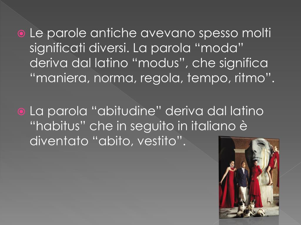 Le parole antiche avevano spesso molti significati diversi. La parola “moda” deriva dal latino “modus”, che significa “maniera, norma, regola, tempo, ritmo”. • La parola “abitudine” deriva dal latino “habitus” che in seguito in italiano è diventato “abito, vestito”.