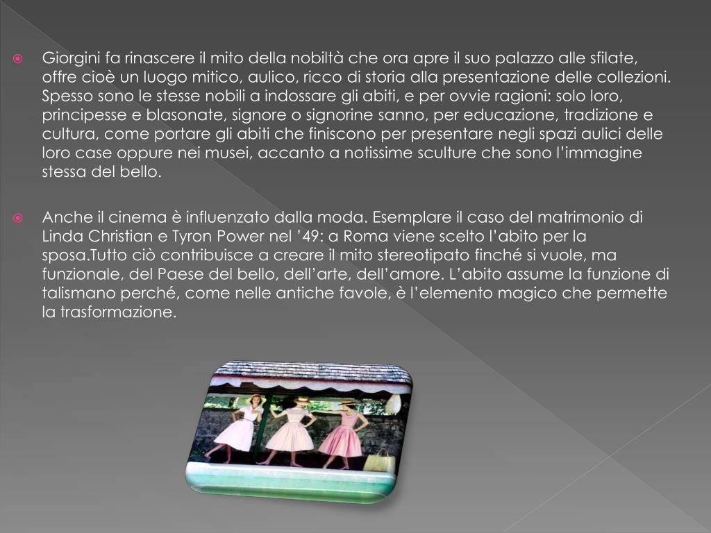 Giorgini fa rinascere il mito della nobiltà che ora apre il suo palazzo alle sfilate, offre cioè un luogo mitico, aulico, ricco di storia alla presentazione delle collezioni. Spesso sono le stesse nobili a indossare gli abiti, e per ovvie ragioni: solo loro, principesse e blasonate, signore o signorine sanno, per educazione, tradizione e cultura, come portare gli abiti che finiscono per presentare negli spazi aulici delle loro case oppure nei musei, accanto a notissime sculture che sono l’immagine stessa del bello. • Anche il cinema è influenzato dalla moda. Esemplare il caso del matrimonio di Linda Christian e Tyron Power nel ’49: a Roma viene scelto l’abito per la sposa.Tutto ciò contribuisce a creare il mito stereotipato finché si vuole, ma funzionale, del Paese del bello, dell’arte, dell’amore. L’abito assume la funzione di talismano perché, come nelle antiche favole, è l’elemento magico che permette la trasformazione.