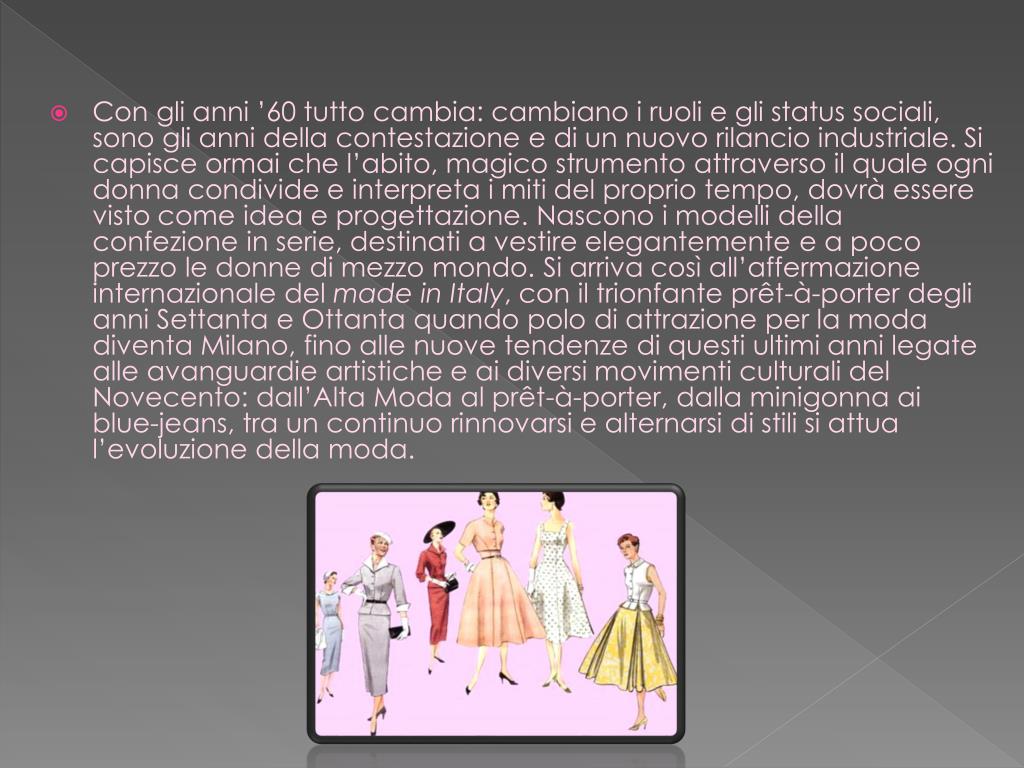Con gli anni ’60 tutto cambia: cambiano i ruoli e gli status sociali, sono gli anni della contestazione e di un nuovo rilancio industriale. Si capisce ormai che l’abito, magico strumento attraverso il quale ogni donna condivide e interpreta i miti del proprio tempo, dovrà essere visto come idea e progettazione. Nascono i modelli della confezione in serie, destinati a vestire elegantemente e a poco prezzo le donne di mezzo mondo. Si arriva così all’affermazione internazionale del made in Italy, con il trionfante prêt-à-porter degli anni Settanta e Ottanta quando polo di attrazione per la moda diventa Milano, fino alle nuove tendenze di questi ultimi anni legate alle avanguardie artistiche e ai diversi movimenti culturali del Novecento: dall’Alta Moda al prêt-à-porter, dalla minigonna ai blue-jeans, tra un continuo rinnovarsi e alternarsi di stili si attua l’evoluzione della moda.