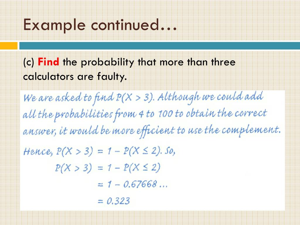 Example continued… (c) Find the probability that more than three calculators are faulty.