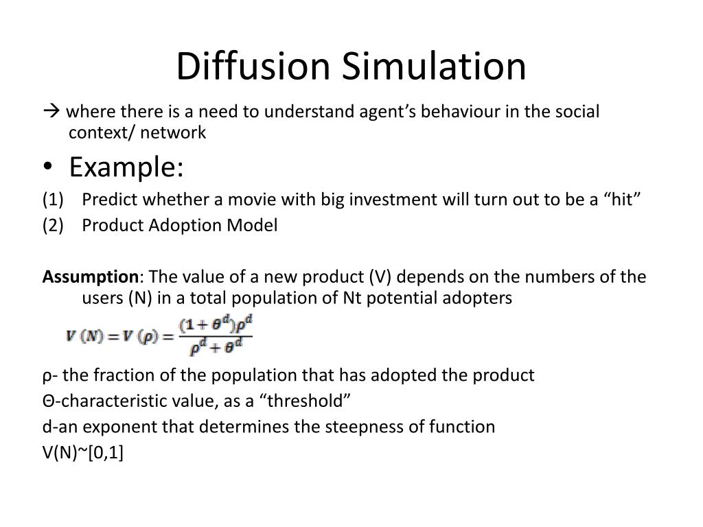 Diffusion Simulation where there is a need to understand agent’s behaviour in the social context/ network • Example: • Predict whether a movie with big investment will turn out to be a “hit” • Product Adoption Model Assumption: The value of a new product (V) depends on the numbers of the users (N) in a total population of Nt potential adopters ρ- the fraction of the population that has adopted the product Θ-characteristic value, as a “threshold” d-an exponent that determines the steepness of function V(N)~[0,1]