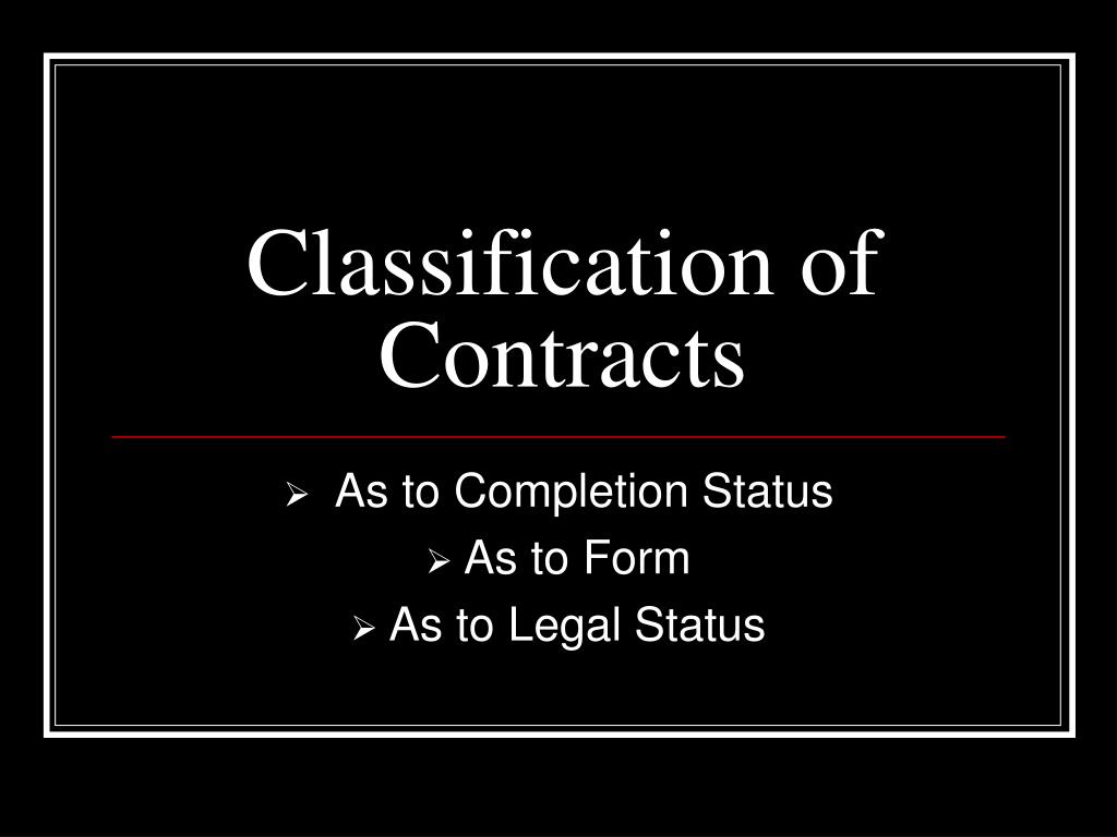 Classification of Contracts As to Completion Status As to Form As to Legal Status