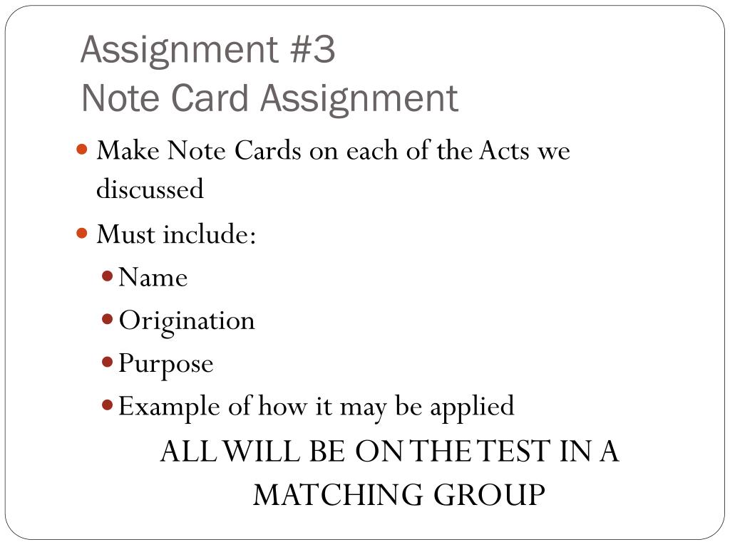 Assignment #3Note Card Assignment • Make Note Cards on each of the Acts we discussed • Must include: • Name • Origination • Purpose • Example of how it may be applied ALL WILL BE ON THE TEST IN A MATCHING GROUP