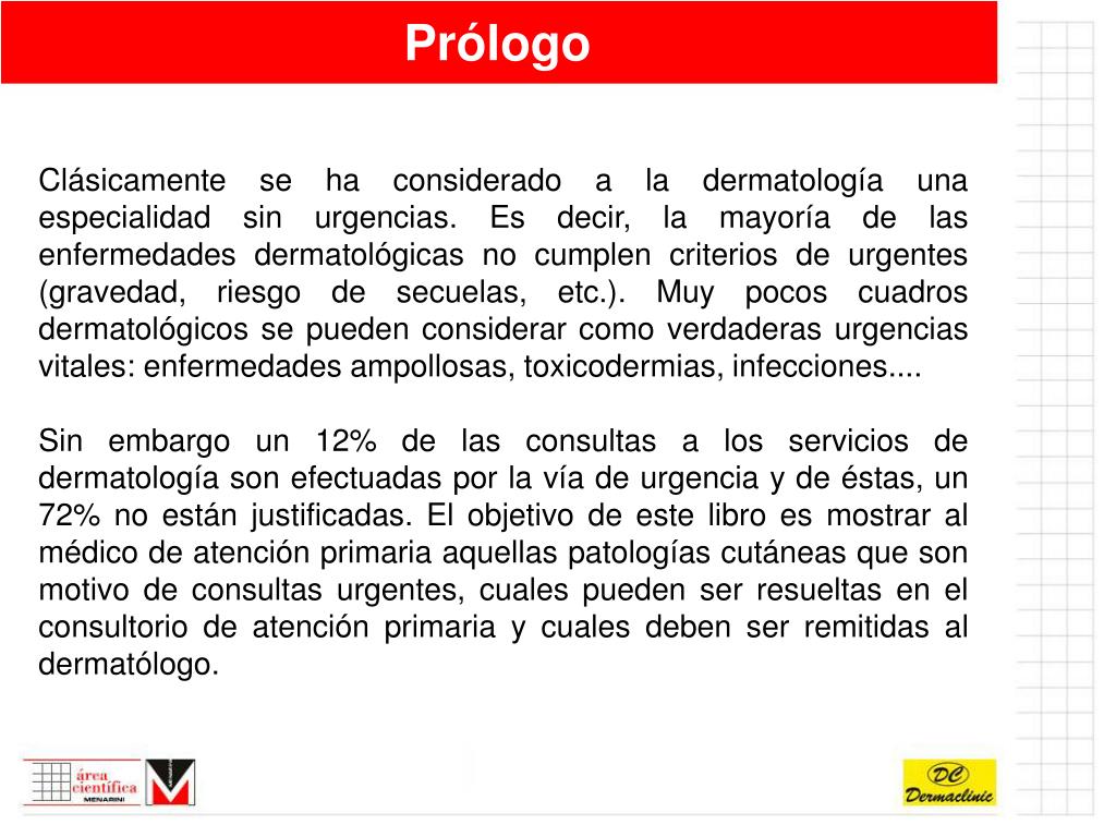 Prólogo Clásicamente se ha considerado a la dermatología una especialidad sin urgencias. Es decir, la mayoría de las enfermedades dermatológicas no cumplen criterios de urgentes (gravedad, riesgo de secuelas, etc.). Muy pocos cuadros dermatológicos se pueden considerar como verdaderas urgencias vitales: enfermedades ampollosas, toxicodermias, infecciones.... Sin embargo un 12% de las consultas a los servicios de dermatología son efectuadas por la vía de urgencia y de éstas, un 72% no están justificadas. El objetivo de este libro es mostrar al médico de atención primaria aquellas patologías cutáneas que son motivo de consultas urgentes, cuales pueden ser resueltas en el consultorio de atención primaria y cuales deben ser remitidas al dermatólogo.