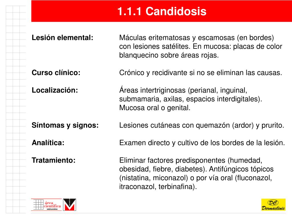 1.1.1 Candidosis Lesión elemental: Máculas eritematosas y escamosas (en bordes) con lesiones satélites. En mucosa: placas de color blanquecino sobre áreas rojas. Curso clínico: Crónico y recidivante si no se eliminan las causas. Localización: Áreas intertriginosas (perianal, inguinal, submamaria, axilas, espacios interdigitales). Mucosa oral o genital. Síntomas y signos: Lesiones cutáneas con quemazón (ardor) y prurito. Analítica: Examen directo y cultivo de los bordes de la lesión. Tratamiento: Eliminar factores predisponentes (humedad, obesidad, fiebre, diabetes). Antifúngicos tópicos (nistatina, miconazol) o por vía oral (fluconazol, itraconazol, terbinafina).