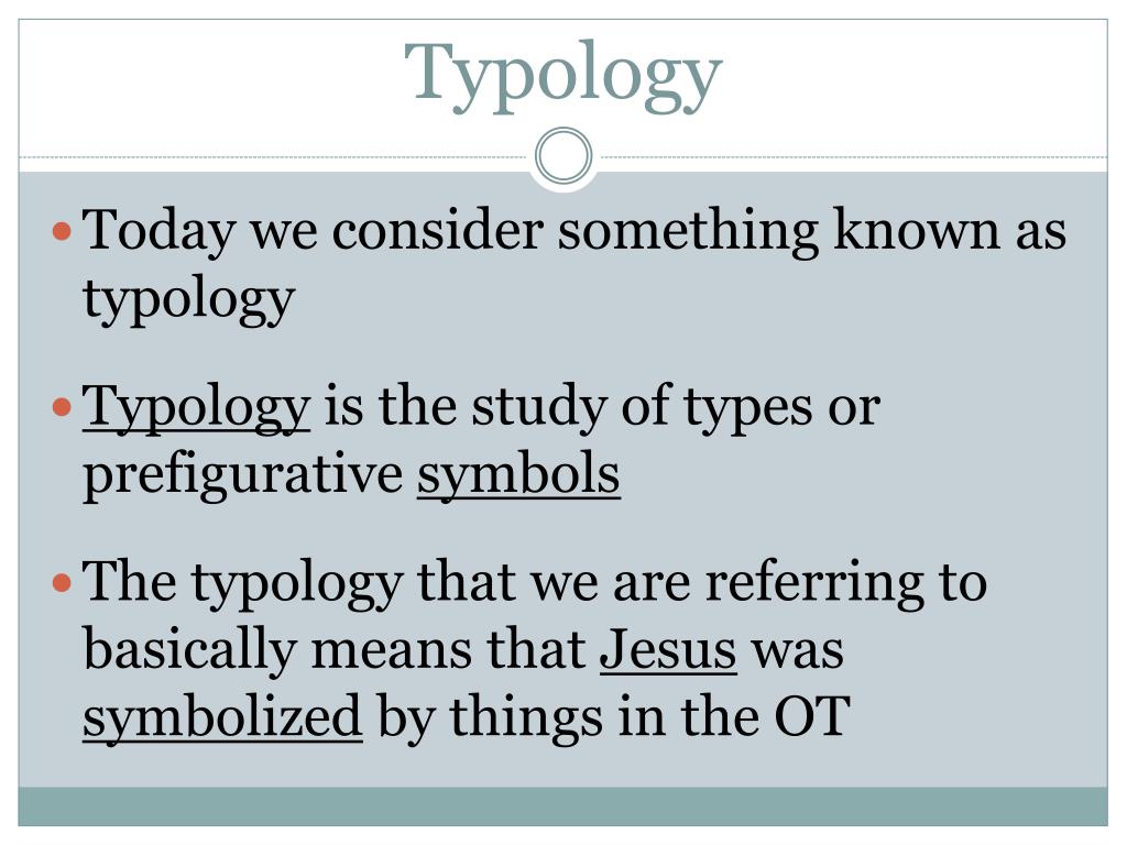 Typology • Today we consider something known as typology • Typology is the study of types or prefigurative symbols • The typology that we are referring to basically means that Jesus was symbolized by things in the OT