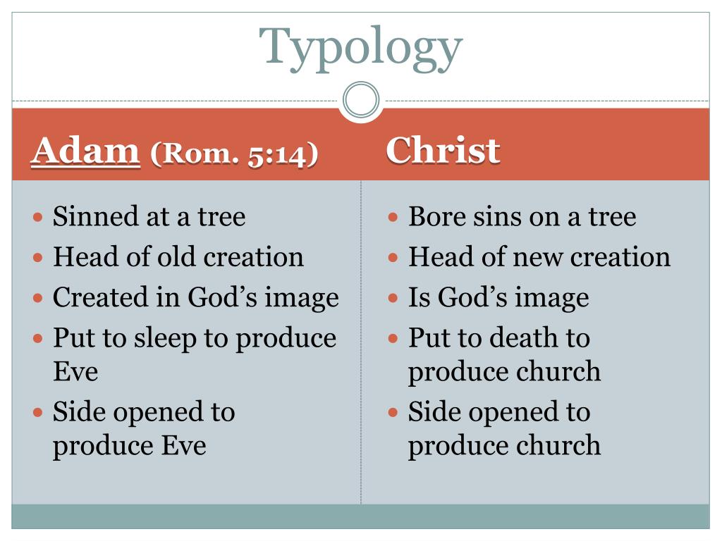 Typology Adam(Rom. 5:14) Christ • Sinned at a tree • Head of old creation • Created in God’s image • Put to sleep to produce Eve • Side opened to produce Eve • Bore sins on a tree • Head of new creation • Is God’s image • Put to death to produce church • Side opened to produce church