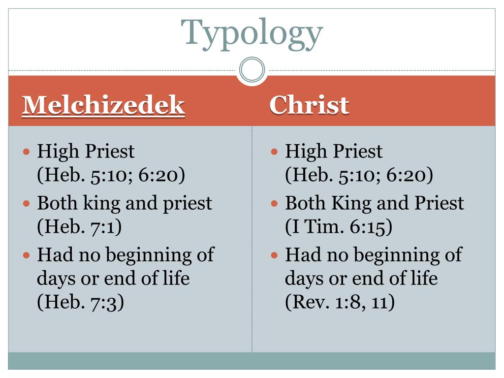 Typology Melchizedek Christ • High Priest (Heb. 5:10; 6:20) • Both king and priest (Heb. 7:1) • Had no beginning of days or end of life (Heb. 7:3) • High Priest (Heb. 5:10; 6:20) • Both King and Priest(I Tim. 6:15) • Had no beginning of days or end of life (Rev. 1:8, 11)