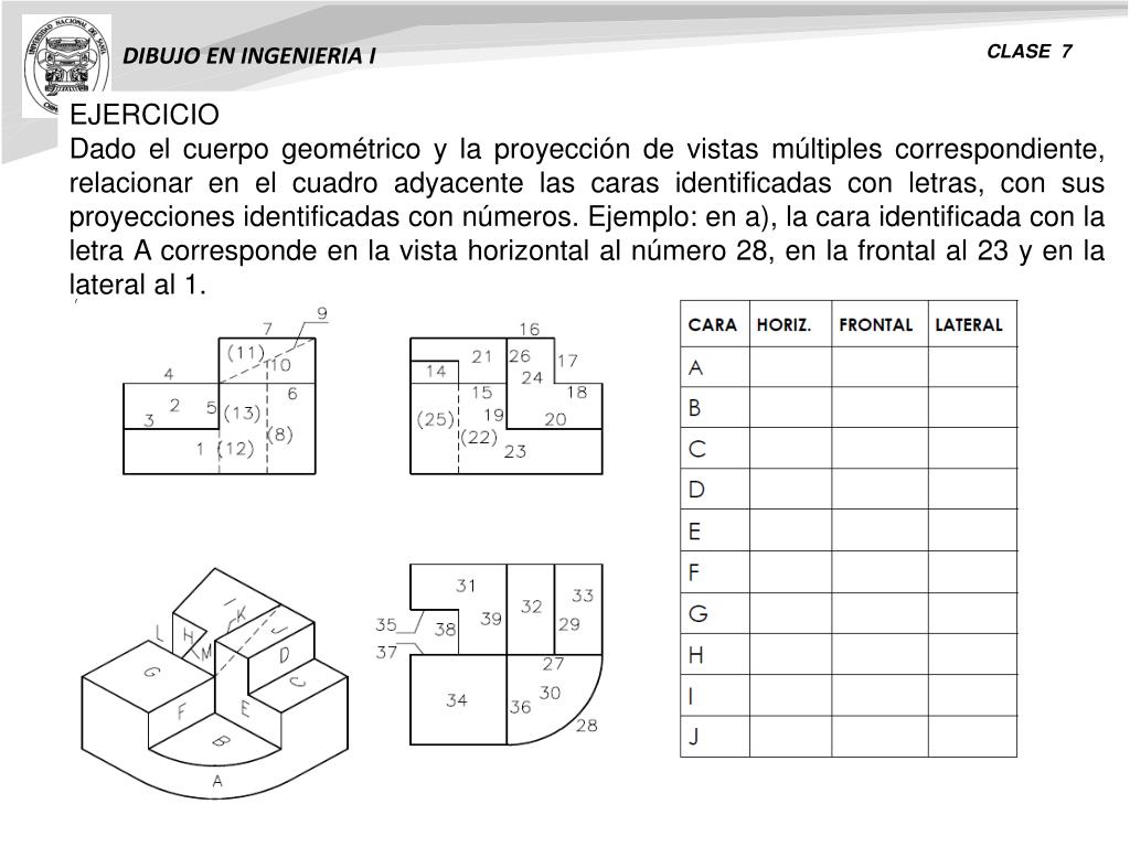 DIBUJO EN INGENIERIA I CLASE 7 EJERCICIO Dado el cuerpo geométrico y la proyección de vistas múltiples correspondiente, relacionar en el cuadro adyacente las caras identificadas con letras, con sus proyecciones identificadas con números. Ejemplo: en a), la cara identificada con la letra A corresponde en la vista horizontal al número 28, en la frontal al 23 y en la lateral al 1.