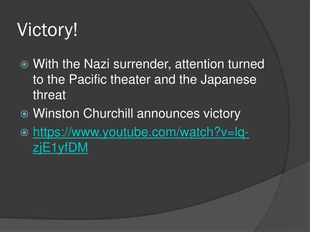 Victory! • With the Nazi surrender, attention turned to the Pacific theater and the Japanese threat • Winston Churchill announces victory • https://www.youtube.com/watch?v=lq-zjE1yfDM