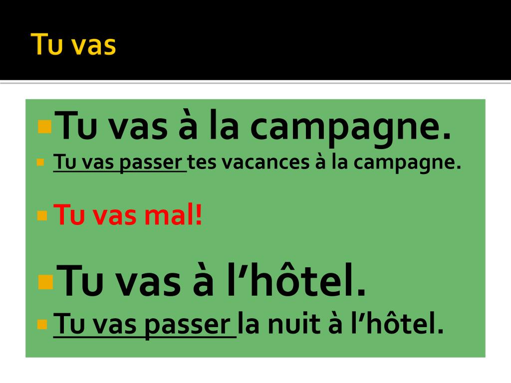 Tu vas • Tu vas à la campagne. • Tu vas passer tesvacances à la campagne. • Tu vas mal! • Tu vas à l’hôtel. • Tu vas passer la nuit à l’hôtel.