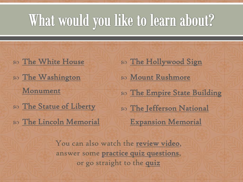 What would you like to learn about? • The White House • The Washington Monument • The Statue of Liberty • The Lincoln Memorial • The Hollywood Sign • Mount Rushmore • The Empire State Building • The Jefferson National Expansion Memorial You can also watch the review video, answer some practice quiz questions, or go straight to the quiz