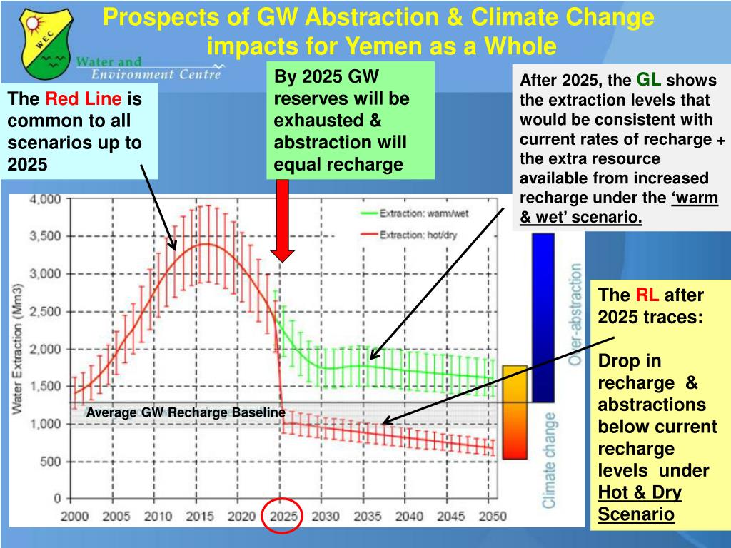 Prospects of GW Abstraction & Climate Change impacts for Yemen as a Whole By 2025 GW reserves will be exhausted & abstraction will equal recharge After 2025, the GLshows the extraction levels that would be consistent with current rates of recharge + the extra resource available from increased recharge under the ‘warm & wet’ scenario. The Red Line is common to all scenarios up to 2025 The RL after 2025 traces: Drop in recharge & abstractions below current recharge levels under Hot & Dry Scenario Average GW Recharge Baseline