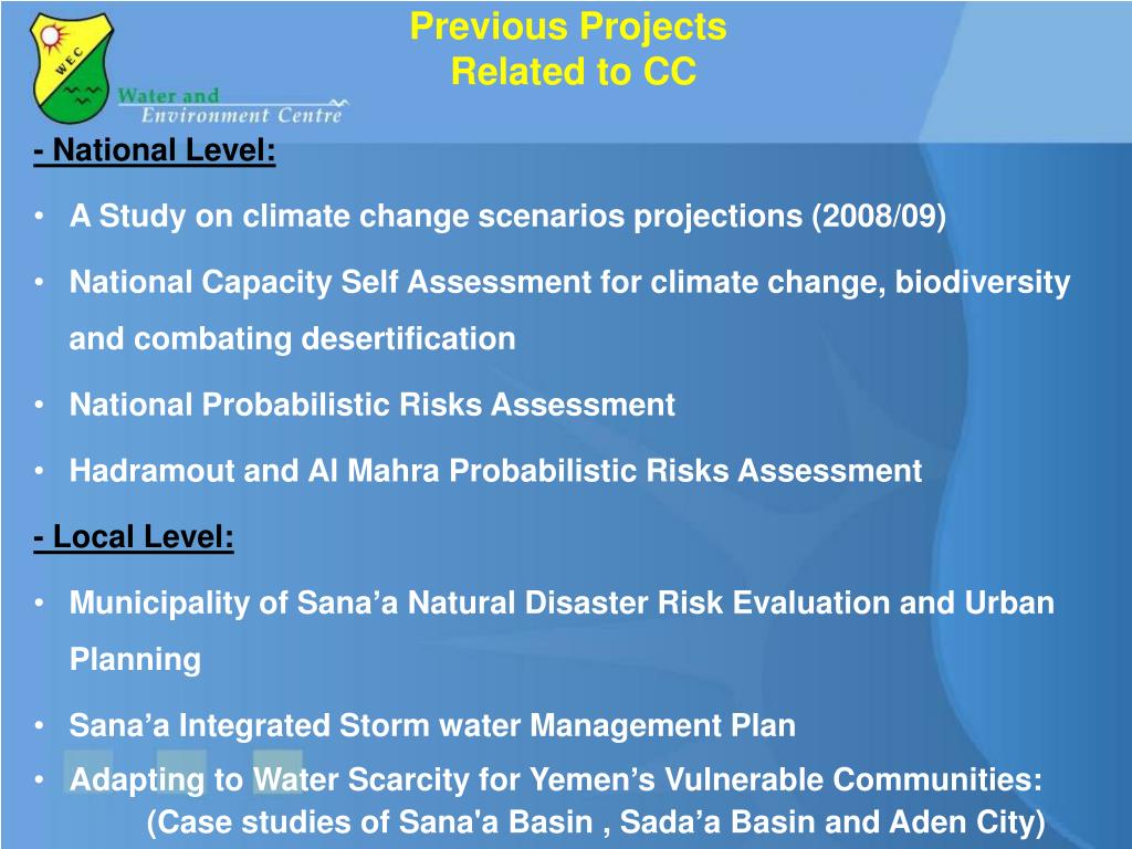 Previous Projects Related to CC • - National Level: • A Study on climate change scenarios projections (2008/09) • National Capacity Self Assessment for climate change, biodiversity and combating desertification • National Probabilistic Risks Assessment • Hadramout and Al Mahra Probabilistic Risks Assessment • - Local Level: • Municipality of Sana’a Natural Disaster Risk Evaluation and Urban Planning • Sana’a Integrated Storm water Management Plan • Adapting to Water Scarcity for Yemen’s Vulnerable Communities: • (Case studies of Sana'a Basin , Sada’a Basin and Aden City)