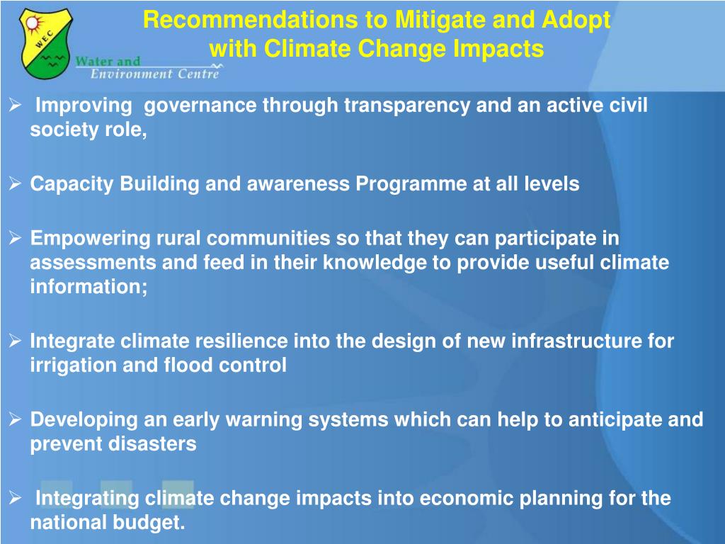 Recommendations to Mitigate and Adopt with Climate Change Impacts • Improving governance through transparency and an active civil society role, • Capacity Building and awareness Programme at all levels • Empowering rural communities so that they can participate in assessments and feed in their knowledge to provide useful climate information; • Integrate climate resilience into the design of new infrastructure for irrigation and flood control • Developing an early warning systems which can help to anticipate and prevent disasters • Integrating climate change impacts into economic planning for the national budget.