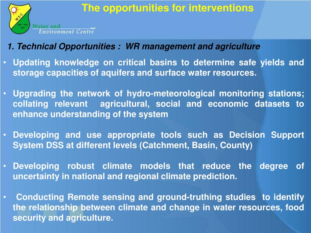 The opportunities for interventions 1. Technical Opportunities : WR management and agriculture • Updating knowledge on critical basins to determine safe yields and storage capacities of aquifers and surface water resources. • Upgrading the network of hydro-meteorological monitoring stations; collating relevant agricultural, social and economic datasets to enhance understanding of the system • Developing and use appropriate tools such as Decision Support System DSS at different levels (Catchment, Basin, County) • Developing robust climate models that reduce the degree of uncertainty in national and regional climate prediction. • Conducting Remote sensing and ground-truthing studies to identify the relationship between climate and change in water resources, food security and agriculture.