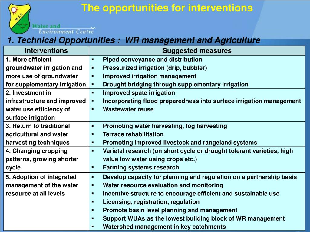 The opportunities for interventions 1. Technical Opportunities : WR management and Agriculture