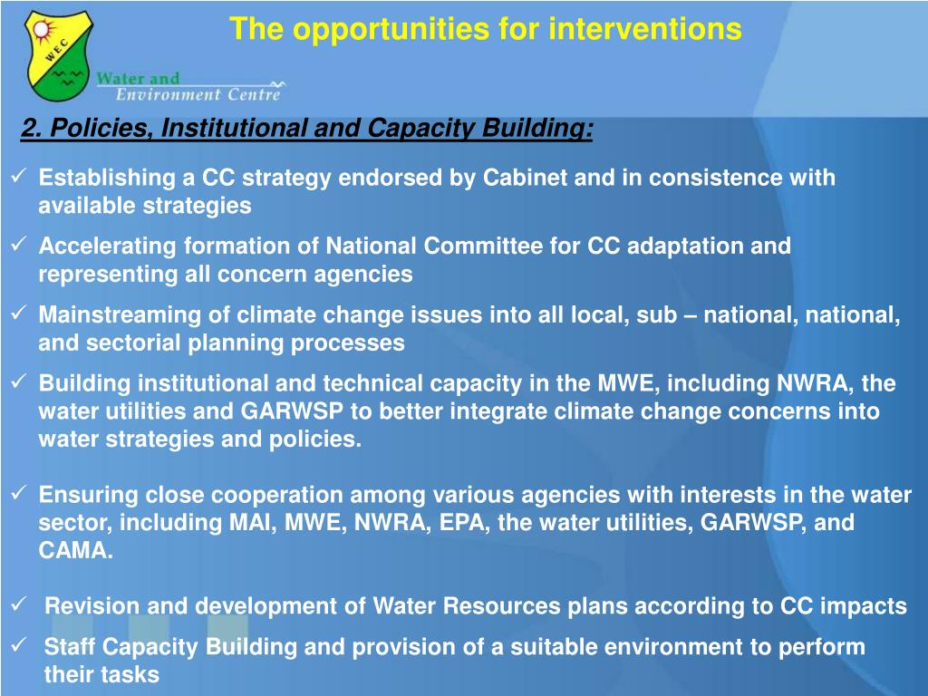 The opportunities for interventions 2. Policies, Institutional and Capacity Building: • Establishing a CC strategy endorsed by Cabinet and in consistence with available strategies • Accelerating formation of National Committee for CC adaptationand representing all concern agencies • Mainstreaming of climate change issues into all local, sub – national, national, and sectorial planning processes • Building institutional and technical capacity in the MWE, including NWRA, the water utilities and GARWSP to better integrate climate change concerns into water strategies and policies. • Ensuring close cooperation among various agencies with interests in the water sector, including MAI, MWE, NWRA, EPA, the water utilities, GARWSP, and CAMA. • Revision and development of Water Resources plans according to CC impacts • Staff Capacity Building and provision of a suitable environment to perform their tasks