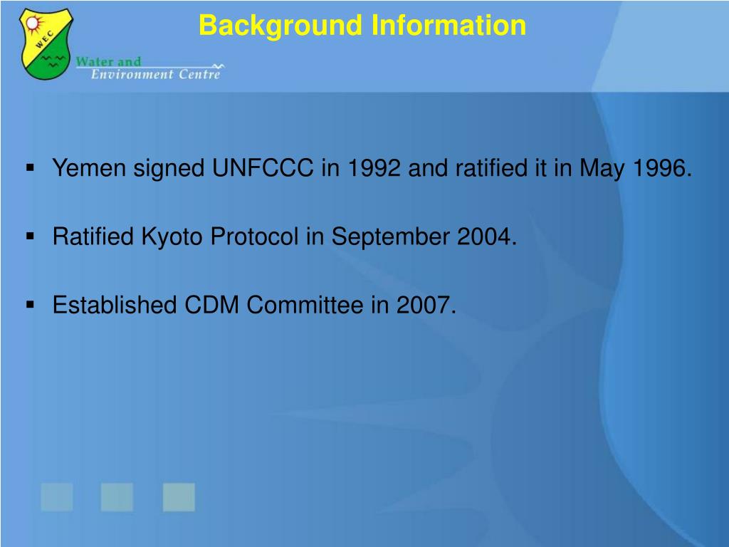 Background Information • Yemen signed UNFCCC in 1992 and ratified it in May 1996. • Ratified Kyoto Protocol in September 2004. • Established CDM Committee in 2007.