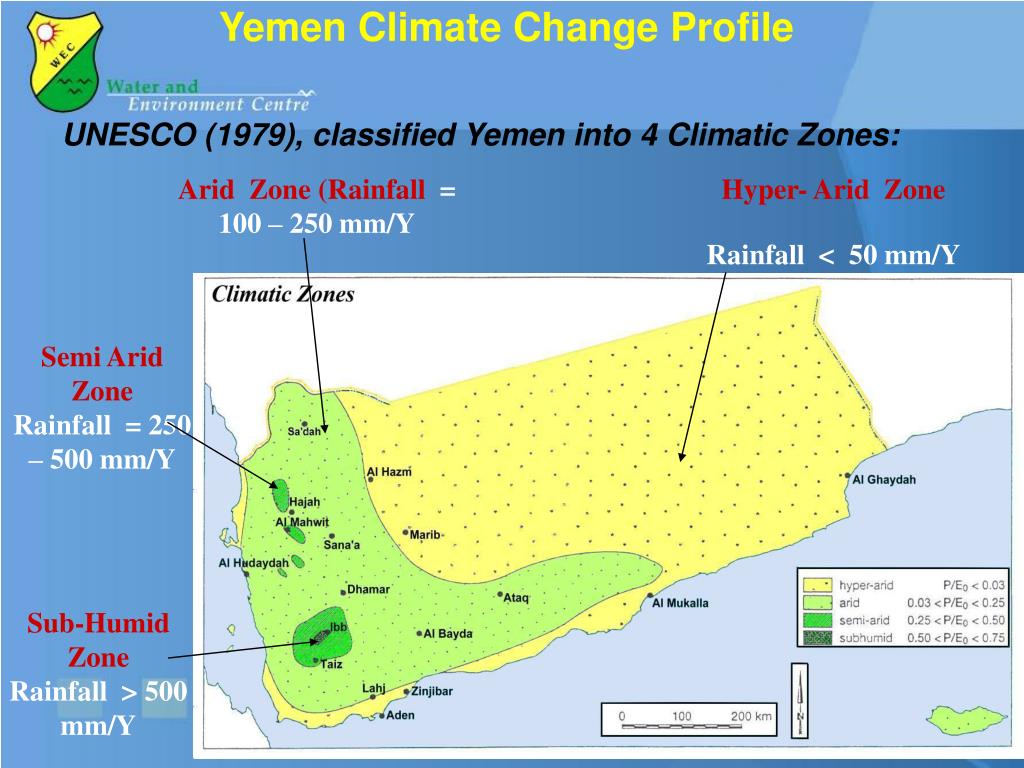 Yemen Climate Change Profile • UNESCO (1979), classified Yemen into 4 Climatic Zones: Hyper- Arid Zone Rainfall < 50 mm/Y Arid Zone (Rainfall = 100 – 250 mm/Y Semi Arid Zone Rainfall = 250 – 500 mm/Y Sub-Humid Zone Rainfall > 500 mm/Y