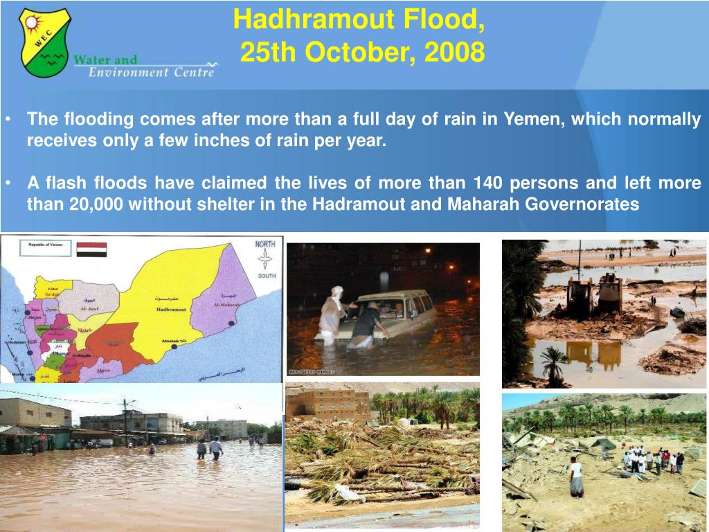 Hadhramout Flood, 25th October, 2008 • The flooding comes after more than a full day of rain in Yemen, which normally receives only a few inches of rain per year. • A flash floods have claimed the lives of more than 140 persons and left more than 20,000 without shelter in the Hadramout and Maharah Governorates