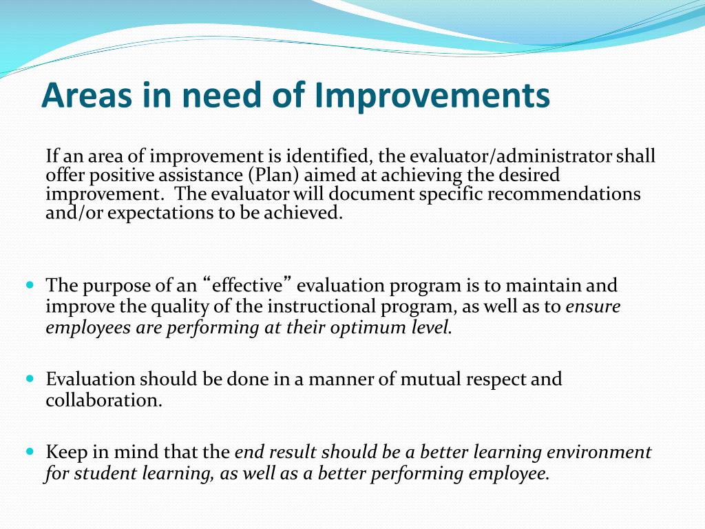 Areas in need of Improvements If an area of improvement is identified, the evaluator/administrator shall offer positive assistance (Plan) aimed at achieving the desired improvement. The evaluator will document specific recommendations and/or expectations to be achieved. • The purpose of an “effective” evaluation program is to maintain and improve the quality of the instructional program, as well as to ensure employees are performing at their optimum level. • Evaluation should be done in a manner of mutual respect and collaboration. • Keep in mind that the end result should be a better learning environment for student learning, as well as a better performing employee.