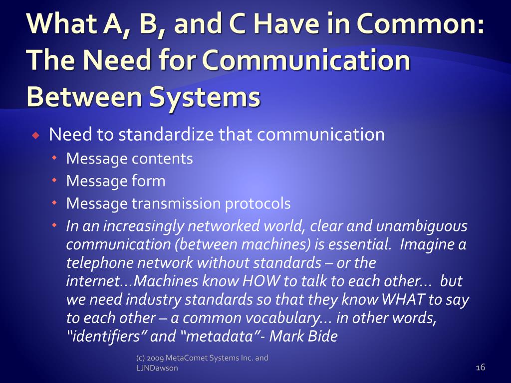 What A, B, and C Have in Common: The Need for Communication Between Systems • Need to standardize that communication • Message contents • Message form • Message transmission protocols • In an increasingly networked world, clear and unambiguous communication (between machines) is essential. Imagine a telephone network without standards – or the internet…Machines know HOW to talk to each other… but we need industry standards so that they know WHAT to say to each other – a common vocabulary… in other words, “identifiers” and “metadata”- Mark Bide (c) 2009 MetaComet Systems Inc. and LJNDawson