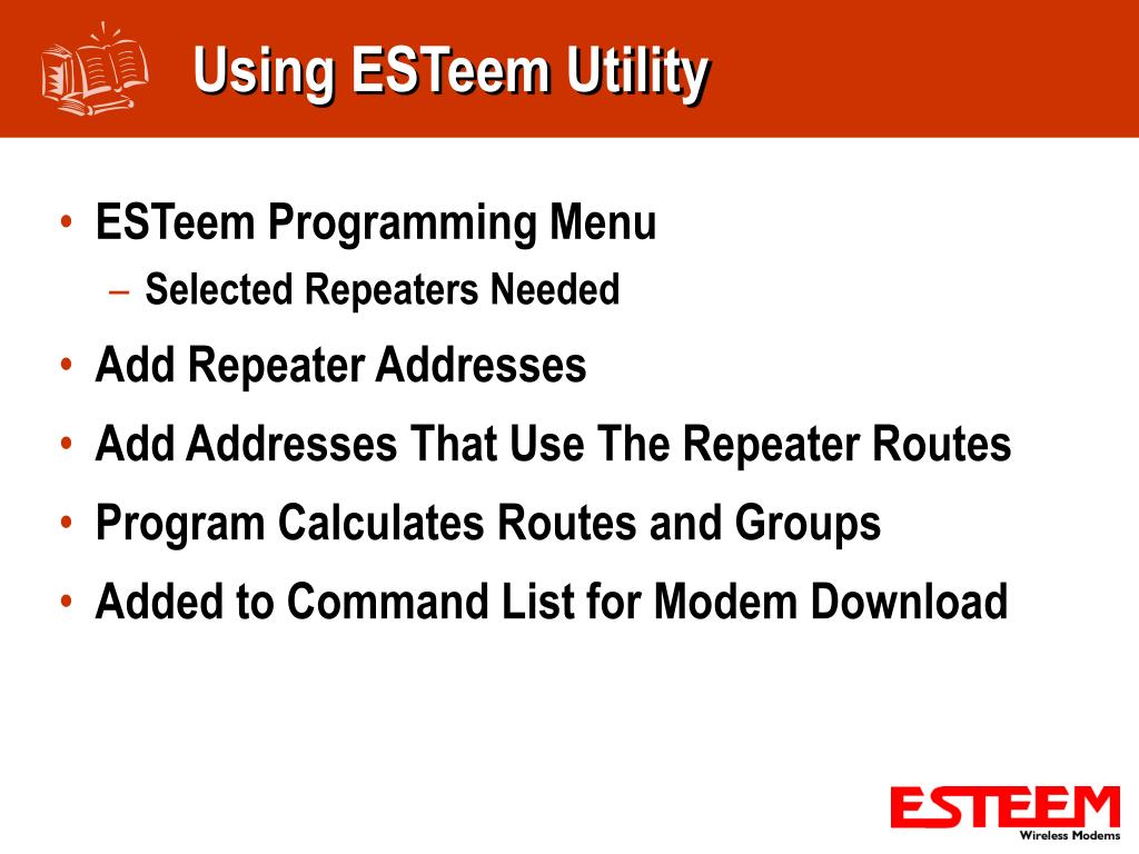 Using ESTeem Utility • ESTeem Programming Menu • Selected Repeaters Needed • Add Repeater Addresses • Add Addresses That Use The Repeater Routes • Program Calculates Routes and Groups • Added to Command List for Modem Download
