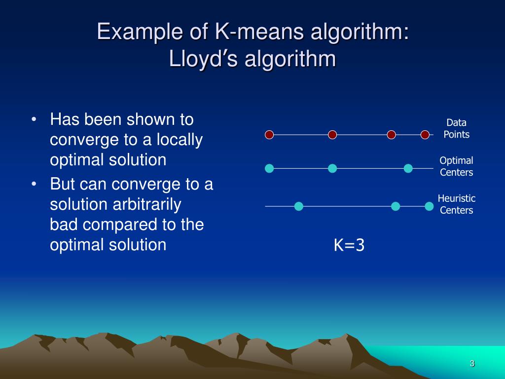 Example of K-means algorithm:Lloyd’s algorithm • Has been shown to converge to a locally optimal solution • But can converge to a solution arbitrarily bad compared to the optimal solution Data Points Optimal Centers Heuristic Centers K=3