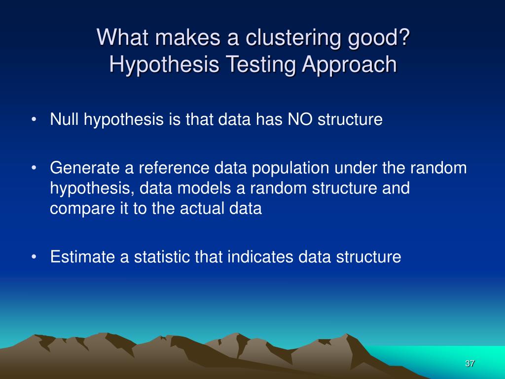 What makes a clustering good?Hypothesis Testing Approach • Null hypothesis is that data has NO structure • Generate a reference data population under the random hypothesis, data models a random structure and compare it to the actual data • Estimate a statistic that indicates data structure