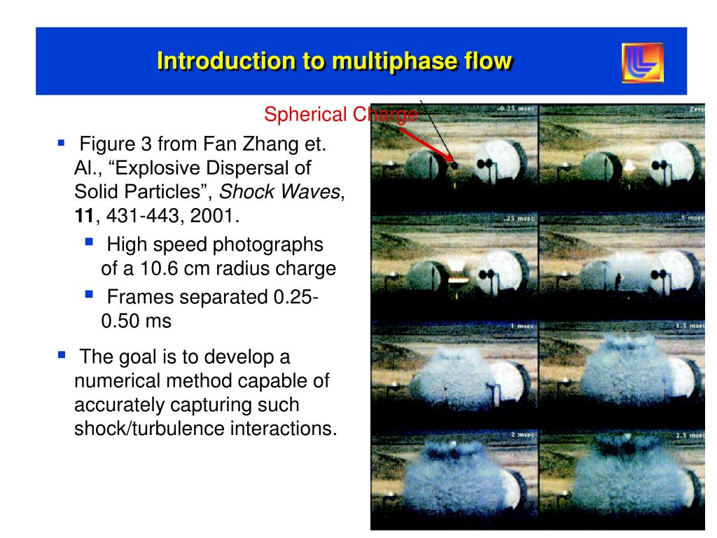 Introduction to multiphase flow Spherical Charge • Figure 3 from Fan Zhang et. Al., “Explosive Dispersal of Solid Particles”, Shock Waves, 11, 431-443, 2001. • High speed photographs of a 10.6 cm radius charge • Frames separated 0.25-0.50 ms • The goal is to develop a numerical method capable of accurately capturing such shock/turbulence interactions.
