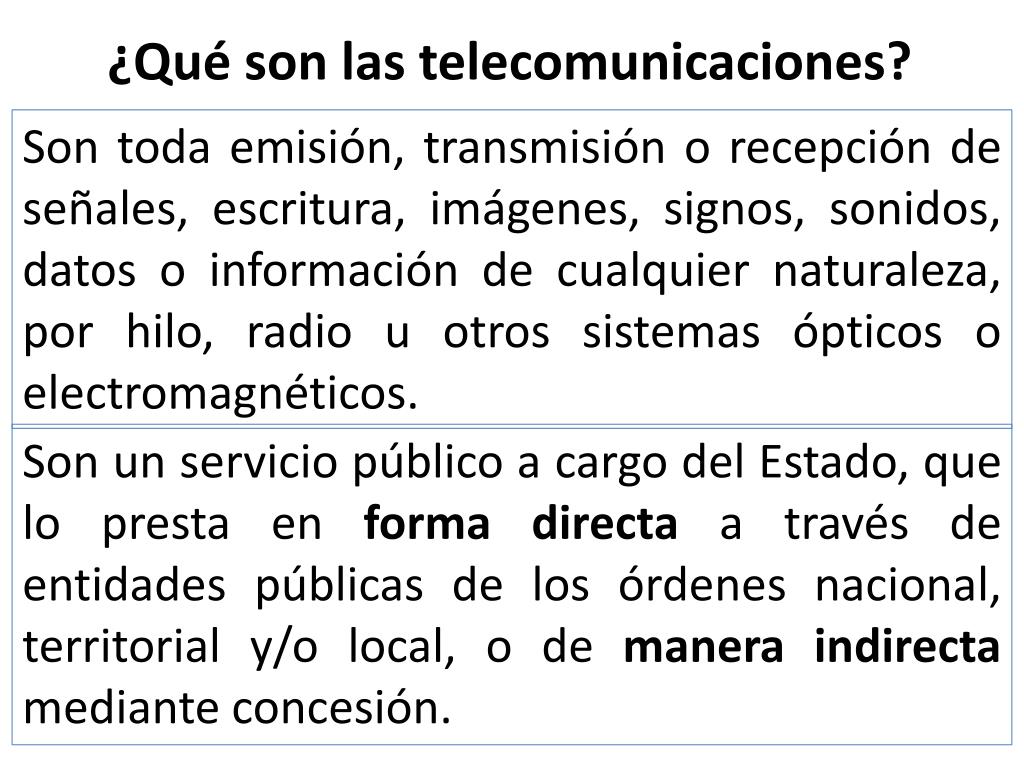 ¿Qué son las telecomunicaciones? Son toda emisión, transmisión o recepción de señales, escritura, imágenes, signos, sonidos, datos o información de cualquier naturaleza, por hilo, radio u otros sistemas ópticos o electromagnéticos. Son un servicio público a cargo del Estado, que lo presta en forma directa a través de entidades públicas de los órdenes nacional, territorial y/o local, o de maneraindirecta mediante concesión.