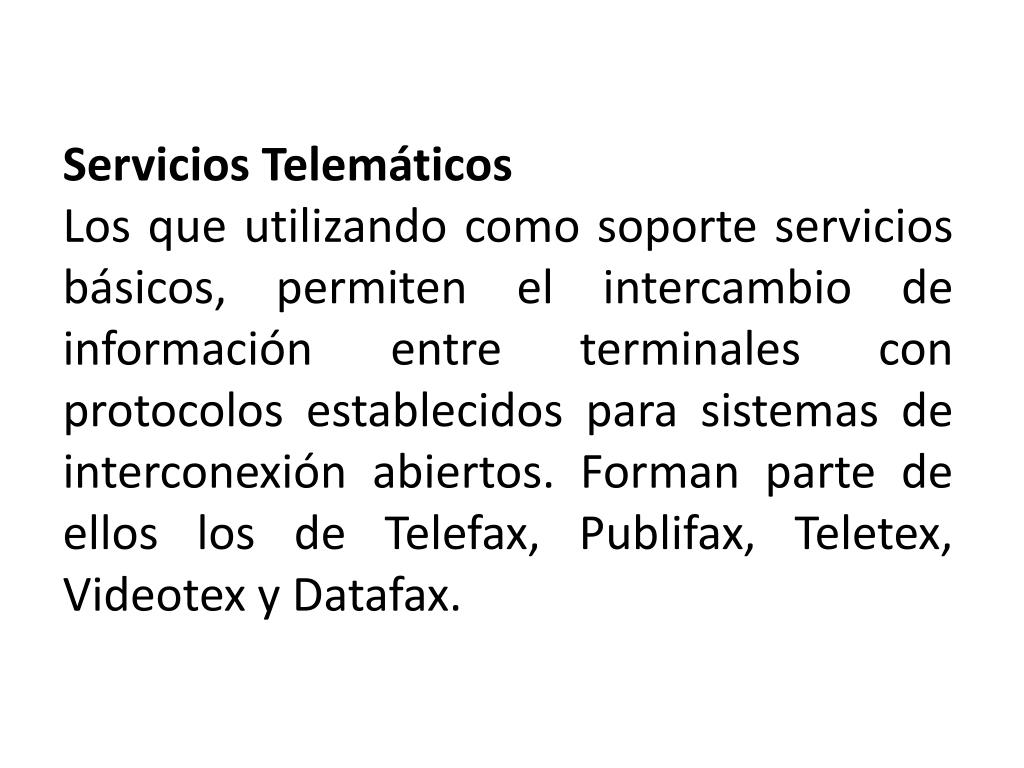 Servicios Telemáticos Los que utilizando como soporte servicios básicos, permiten el intercambio de información entre terminales con protocolos establecidos para sistemas de interconexión abiertos. Forman parte de ellos los de Telefax, Publifax, Teletex, Videotex y Datafax.