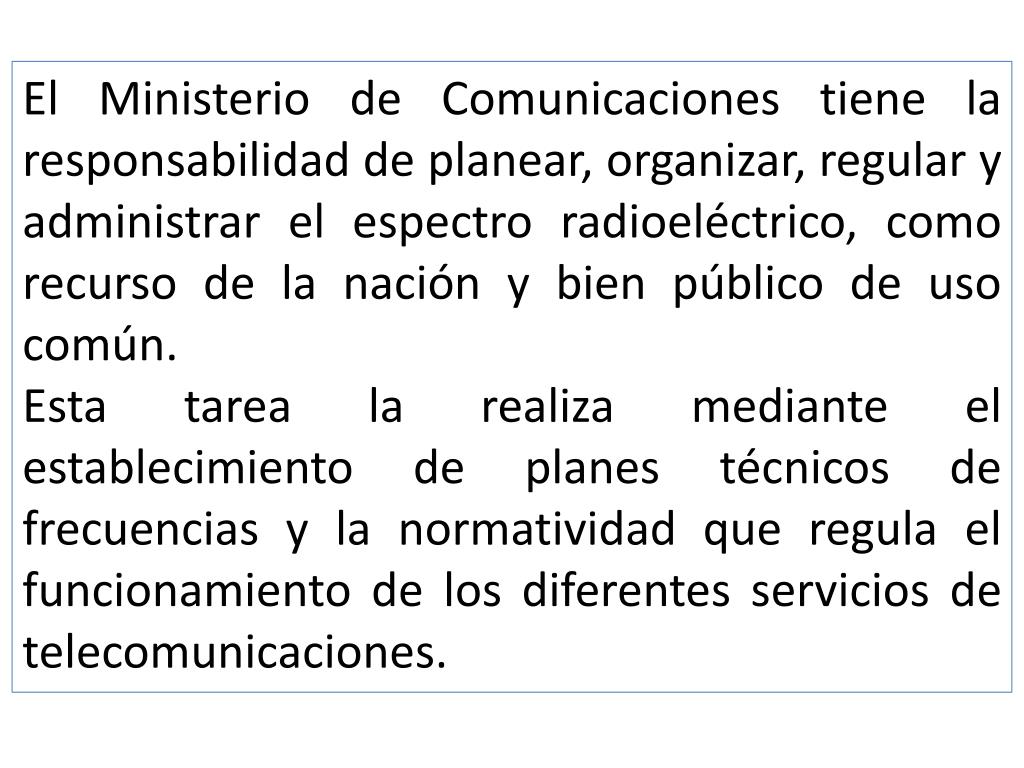 El Ministerio de Comunicaciones tiene la responsabilidad de planear, organizar, regular y administrar el espectro radioeléctrico, como recurso de la nación y bien público de uso común. Esta tarea la realiza mediante el establecimiento de planes técnicos de frecuencias y la normatividad que regula el funcionamiento de los diferentes servicios de telecomunicaciones.