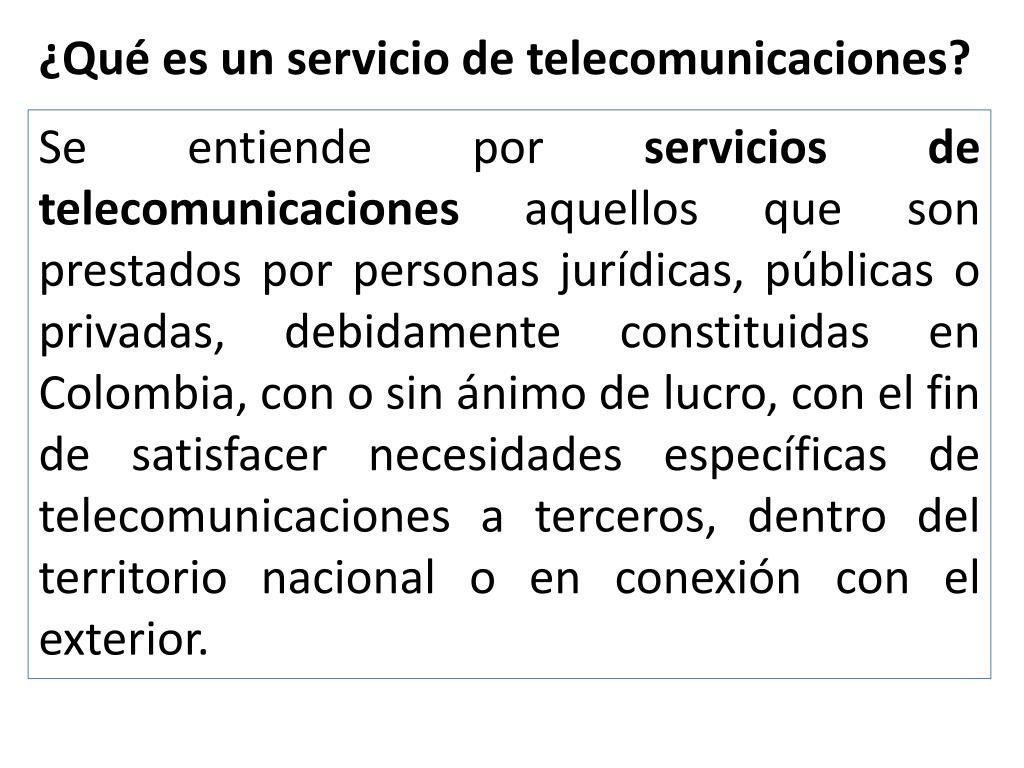 ¿Qué es un servicio de telecomunicaciones? Se entiende por servicios de telecomunicaciones aquellos que son prestados por personas jurídicas, públicas o privadas, debidamente constituidas en Colombia, con o sin ánimo de lucro, con el fin de satisfacer necesidades específicas de telecomunicaciones a terceros, dentro del territorio nacional o en conexión con el exterior.