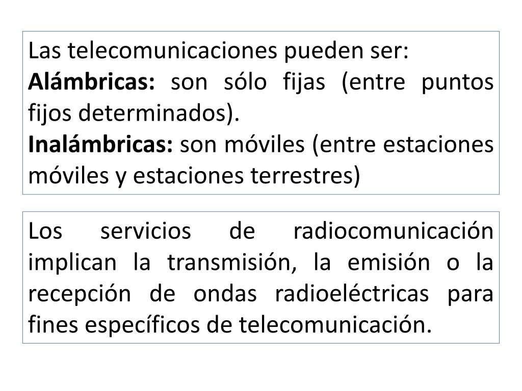 Las telecomunicaciones pueden ser: Alámbricas: son sólo fijas (entre puntos fijos determinados). Inalámbricas: son móviles (entre estaciones móviles y estaciones terrestres) Los servicios de radiocomunicación implican la transmisión, la emisión o la recepción de ondas radioeléctricas para fines específicos de telecomunicación.