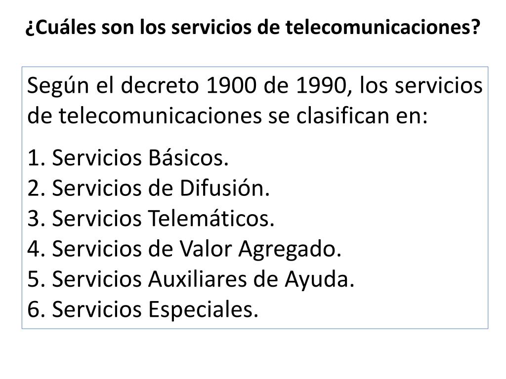 ¿Cuáles son los servicios de telecomunicaciones? Según el decreto 1900 de 1990, los servicios de telecomunicaciones se clasifican en: 1. Servicios Básicos. 2. Servicios de Difusión. 3. Servicios Telemáticos. 4. Servicios de Valor Agregado. 5. Servicios Auxiliares de Ayuda. 6. Servicios Especiales.