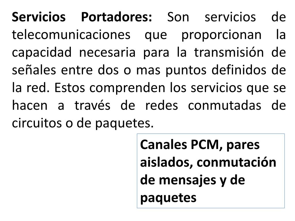 Servicios Portadores: Son servicios de telecomunicaciones que proporcionan la capacidad necesaria para la transmisión de señales entre dos o mas puntos definidos de la red. Estos comprenden los servicios que se hacen a través de redes conmutadas de circuitos o de paquetes. Canales PCM, pares aislados, conmutación de mensajes y de paquetes