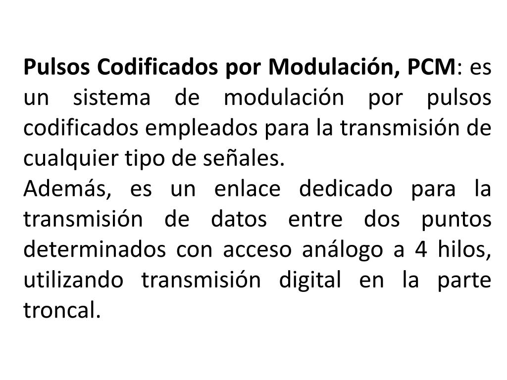 Pulsos Codificados por Modulación, PCM: es un sistema de modulación por pulsos codificados empleados para la transmisión de cualquier tipo de señales. Además, es un enlace dedicado para la transmisión de datos entre dos puntos determinados con acceso análogo a 4 hilos, utilizando transmisión digital en la parte troncal.