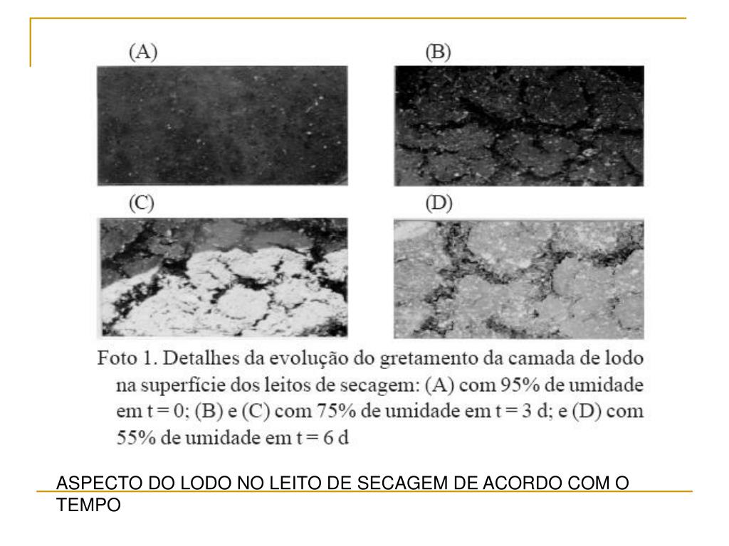 3- Desidratação do lodo • Objetivo: é elevar o teor de sólidos geralmente acima de 20%, de modo a reduzir o volume a ser transportado e a permitir a sua disposição final em aterros, agricultura, etc..; • Tipos de desidratação: natural ou mecanizada. • Leitos de secagem • São geralmente compostos por: tanques de armazenamento, camada drenante e cobertura. • Princípio de funcionamento: Separação natural água-sólido devido especialmente a liquefação devido a diferença de peso específico do sólido e da água; evaporação natural da água e evaporação devido ao poder calorífico do lodo.